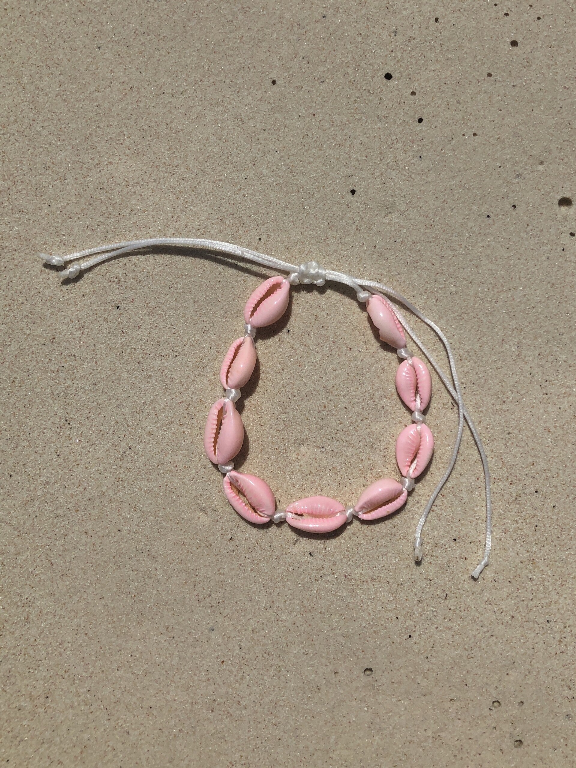 Wij maken gebruik van echte kauri schelpjes. Bij dit enkelbandje zijn de schelpjes licht roze en afgewerkt met een wit satijnkoord met een verschuifbare knoop. Zodat deze precies op maat verstelbaar is.
